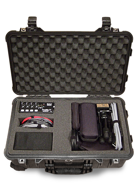 The LX FUSION Interview/Meeting HD Video Recording Kit includes the LXF HD recorder, two tripods, equipment field pouch, active audio processor/interface, multi-channel audio mixer, four omni-directional condenser microphones, balanced XLR microphone cables, a power bank battery/power supply housed in a waterproof ballistic nylon transport case.